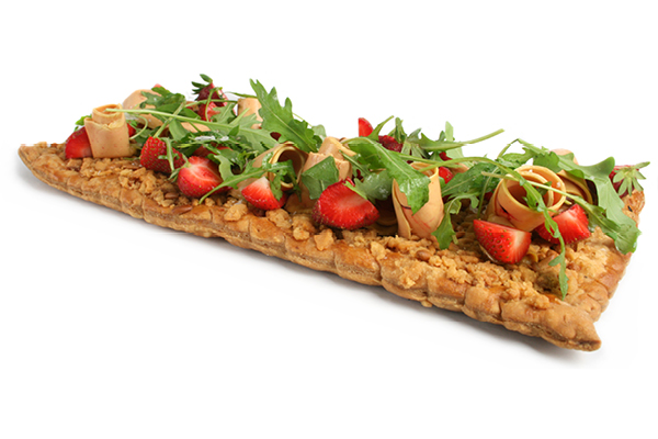 Amb maduixes Charlot de Sant Pol de Mar, foie marinat i pinyons.